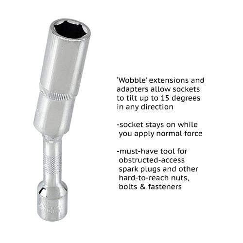 - Feature : Premium-grade socket accessory for professional mechanic & serious DIYer's / Wobble anvil allows up to 15-degree tilt in any direction without loss of power / Must-have for work in limited-access jobs like changing spark plugs / Extra-strong Chrome-Vanadium steel alloy, mirror chrome finish for easy clean-up / 3", 6" & 8"-length extensions. 3/8"-drive, also available in 1/4 & 1/2". Made in Taiwan