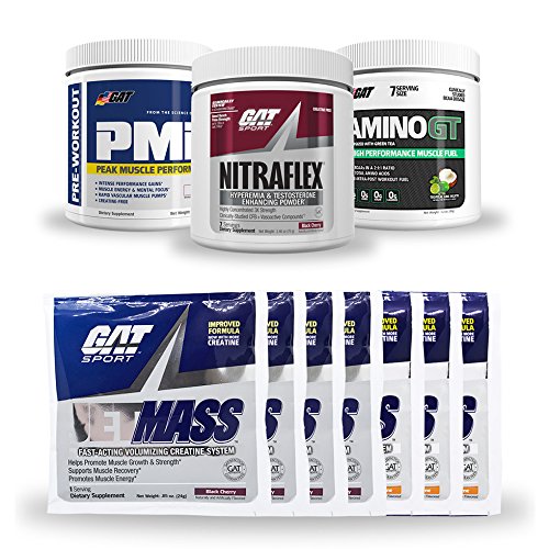 Nitraflex pre-workout delivers fast, explosive training results for a more powerful body, including energy, stamina, Nitric Oxide (NO) and testosterone levels. It contains proven muscle building L-Citrulline malate, L-Arginine, L-Arginine Alpha-ketoglutarate (AKG) amino acids and Calcium Fructoborate (CFB), a natural, high potency form of Boron which has been shown to support free testosterone. Amino GT contains 8 grams of amino acids to support muscle growth and repair. Athletes who exercise strenuously require additional amino acids for energy, muscle building and recovery. Amino GT also includes 5 grams of BCAAs, the dosage that has been clinically shown to reduce muscle soreness and assist with recovery. The 2:1:1 ratio of Leucine to Isoleucine and Valine is the most scientically studied for athletic performance. Shown to be effective in numerous studies to promote protein synthesis and encourage a positive protein balance in the muscles when you need it most. The 2:1:1 ratio has also been shown to reduce muscle damage and accelerate recovery from resistance training. PMP by GAT delivers the next generation of intense pre-workouts. Blast through training plateaus and take your sports endurance and muscular output to the next level. Experience more massive pumps, laser-focus, and workout intensity. A powerful blend of clinically researched key ingredients formulated to deliver the ultimate in Peak Muscle Performance. JetMASS provides a superior Creatine driven formulation for athletes with goals for exercise-induced gains in muscle, strength and performance specically formulated to increase uptake of Creatine, add lean muscle mass, increase muscle torque and speed recovery times. JetMASS now contains 5 grams of premium grade Creapure® Creatine monohydrate, the recommended daily level supported by research. No form of Creatine delivers creatine uptake into muscles better than Creatine Monohydrate.Feature