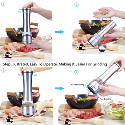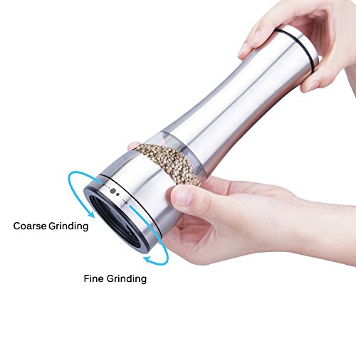 LARGE CAPACITY & ADJUSTABLE GRINDING: With large 6 oz capacity of the Stainless Steel Spice Grinder, you don't have to worry about refilling the spices frequently. Each of our beautiful professional salt and pepper grinders, contains an efficient adjustable non-corrosive superior ceramic mechanism so whether you like a fine or coarse grind simply twist to adjust the coarseness that makes it effortless to grind.
