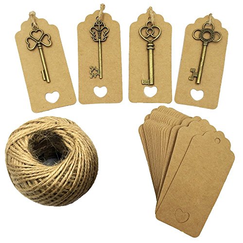 Mmei Set of 40 Vintage Bronze Skeleton Key Charm with Kraft Paper Gift Tags and 30 Yards Natural Jute Twine for Wedding Decoration Favor DIY Crafts (Mix - Bronze)