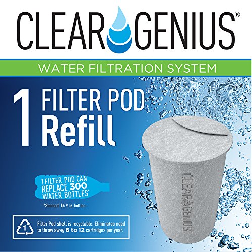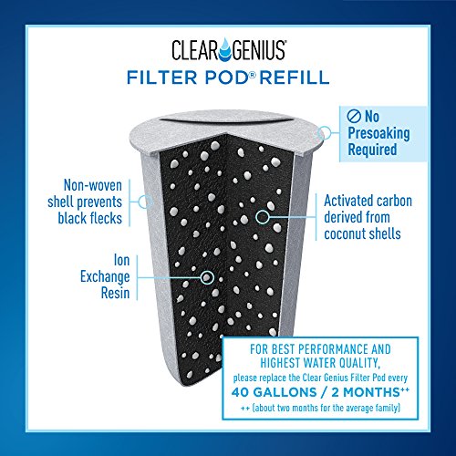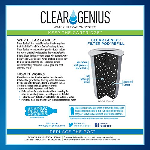 CONTENTS: 1- Clear Genius Water Pitcher, 1- Clear Genius Reusable Cartridge and 1- Filter Pod. The Filter Pod filters 40 gallons of water - the equivalent of 300 (16.9 oz.) containers of bottled water. Certified by Water Quality Association. Made with BPA-free materials.