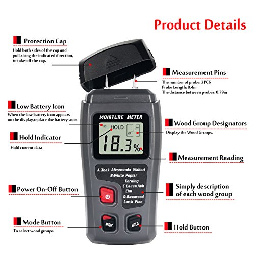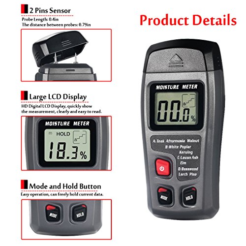 Digital Moisture Meter,V-Resourcing HD Digital LCD Display 2 Pins Sensor Wood Moisture Tester Water Content,Range 0~99.9% Wood Moisture Detector