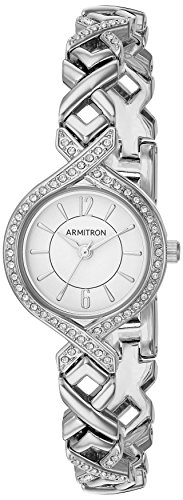 Bezel set with 50 clear Swarovski crystals; glossy white dial with silver-tone hands and markers; silver-tone "X" shaped bracelet with Swarovski crystals; adjustable end links; jewelry clasp closure