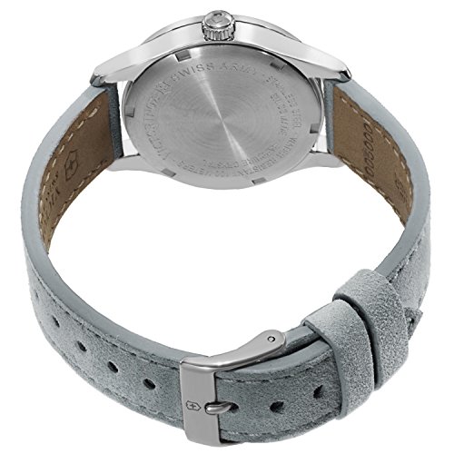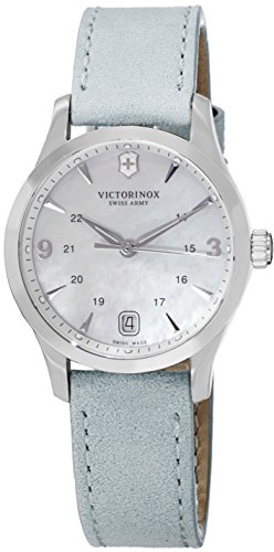 Stainless steel case with a light blue leather strap. Fixed stainless steel bezel. Light blue mother of pearl dial with silver-tone hands and index hour markers. Arabic numerals mark the 3 and 9 o'clock positions. Victorinox logo marks the 12 o'clock position. 24 hour markers. Minute markers around the outer rim. Dial Type: Analog. Luminescent hands and markers. Date display at the 6 o'clock position. Quartz movement. Scratch resistant sapphire crystal. Solid case back. Case diameter: 30 mm. Case thickness: 8 mm. Round case shape. Tang clasp. Water resistant at 100 meters / 330 feet. Functions: date, hour, minute, second. Casual watch style. Watch label: Swiss Made. Victorinox Alliance Small Mother of Pearl Dial Leather Strap Ladies Watch 241661.Feature