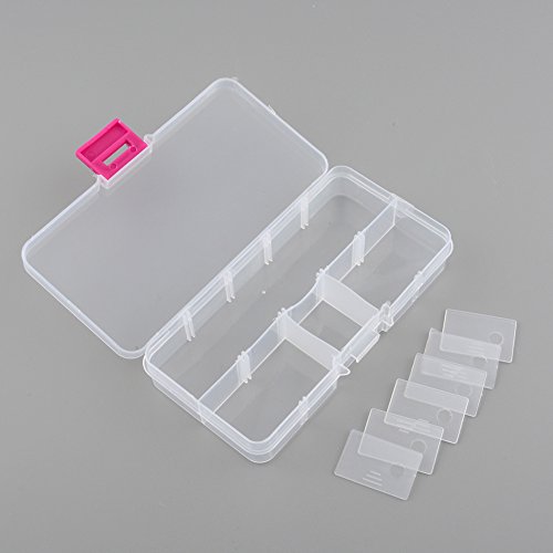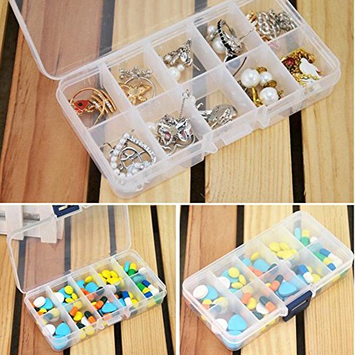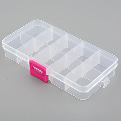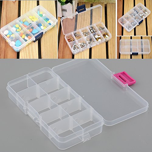 - Feature : Size:13.2*6.8*2.3cm. / Multifunctional design, which can store some small accessories. / Material: Hard Plastic. Case Color: Clear. / Designed with 10 rectangle compartments, and the compartment can be adjusted by pulling the plastic sheet. / It can be used to store earrings, necklace, bead, finger ring or other small jewelry, also is used for storing fishing hook, fish lure bait or other small tool kit.