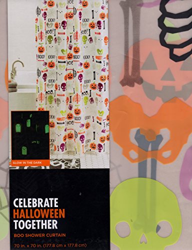 -. Feature : 100% Polyethylene Vinyl Acetate / Glow in the dark Halloween design. 70 x 70 inches / Pattern features skulls, pumpkin jack o lanterns, bones spider webs and more / The words BOO! EEK! are also shown throughout the pattern / Enhance your Halloween Bathrroom decor with this unique seasonal themed shower curtain