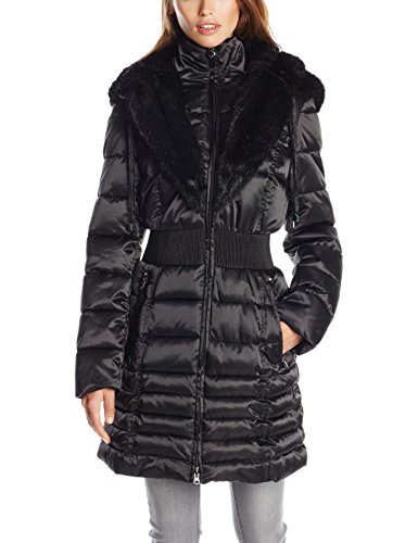 Channel-quilt coat featuring zip front, funnel collar, and faux fur-lined cape hood