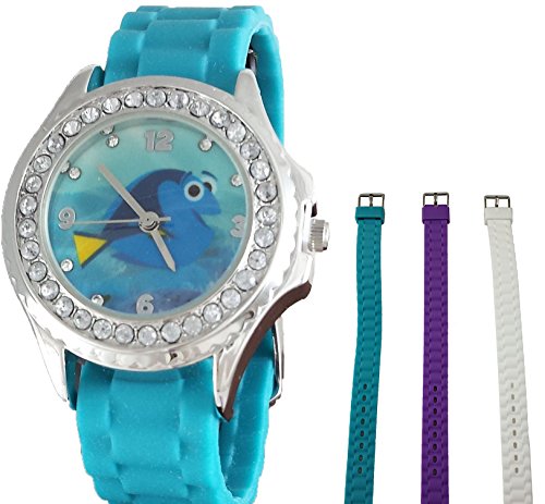 -. Binding : Watch -. Brand : Disney -. Department : girls -. EAN : 0030506415855 -. Feature : 3 Color Straps To Choose from(white,purple and teal) / Stainless Steel case and glass face to prevent any nicks / Rhinestones around face and on hour markers to give off a dazzling look / Adjustable band from 5-7 inches with a stainless steel buckle closure / Perfect for a gift with a nice Finding Dory Gift Box -. Label : Accutime -. Manufacturer : Accutime -. Model : 00-2KAODY- -. MPN : FDO30155ST -. PackageQuantity : 1 -. PartNumber : FDO30155ST -. ProductGroup : Watch -. ProductTypeName : WATCH -. Publisher : Accutime -. Studio : Accutime -. Title : Disney Girls Finding Dory 3 Color Interchangeable Watch w/Stainless Steel Case and Rhinestones -. UPC : 030506415855