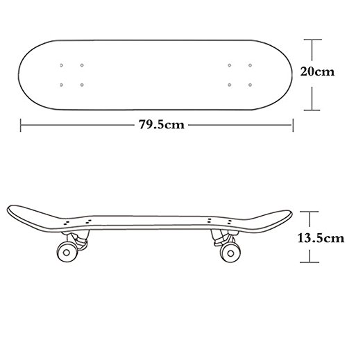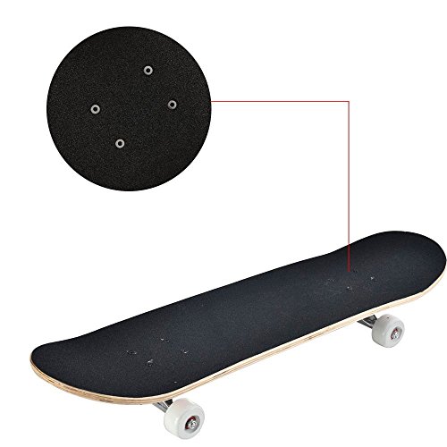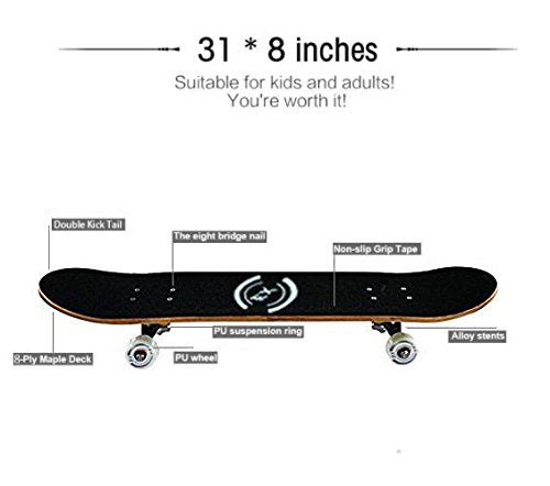 -. Brand : DIYUSI -. Feature : HIGHT QUALITY --- High quality solid PU wheel with impact resistance ABS material base; ABEC-9 High-speed precision bearing; High performance 5 inch Seagull solid aluminum Trucks; 8 layer panel with Canadian maple; High density waterproof anti-skidding diamond emery paper for the skateboarding / ENOUGH LOAD BEARING --- Up to 220 Lbs ,moreover, the solid PU wheel is perfect for long distance skateboarding / NO ASSEMBLY REQUIRED --- Just play and enjoying with the skateboards / IDEAL FOR ANY SKILL LEVEL --- Beginner advanced expert intermediate skater to do some basic stunts such 360's, OL action and a few other basic tricks with this skateboards -. IsAutographed : 0 -. IsMemorabilia : 0 -. Label : Worldwild -. Manufacturer : Worldwild -. MPN : ww-skate-000A -. PackageQuantity : 1 -. PartNumber : ww-skate-000A -. ProductGroup : Sports -. ProductTypeName : OUTDOOR_RECREATION_PRODUCT -. Publisher : Worldwild -. Size : X-Large -. Studio : Worldwild -. Title : Pro Skateboard 31" X 8" Standard Skateboards Cruiser Complete Canadian Maple 8 Layers Double Kick Concave Skate Boards
