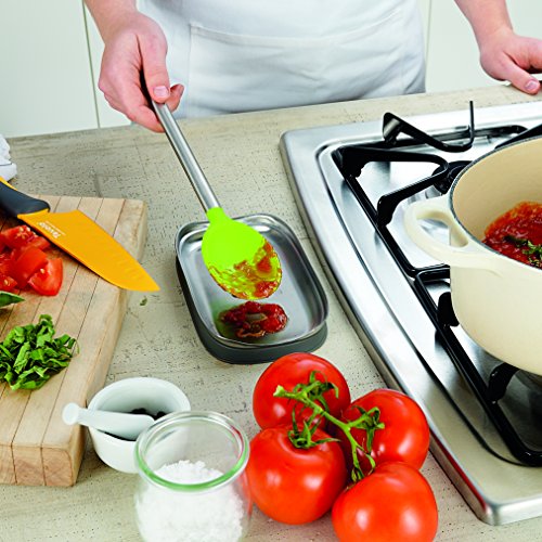 Studio : Tovolo Publisher : Tovolo Binding : Kitchen Product Description Give it a rest…or two! Our ingenious Tovolo Stainless Steel Spoon Rest doubles when needed to eliminate cross-contamination. Held together with a strong magnet, these two spoon rests nest neatly together, taking up minimal space. The higher edge makes tools easy to grab while the smooth contours of each rest make for easy cleaning. These spoon rests measure 9.25”L x 3.5”W x 1”H and are dishwasher safe. 0