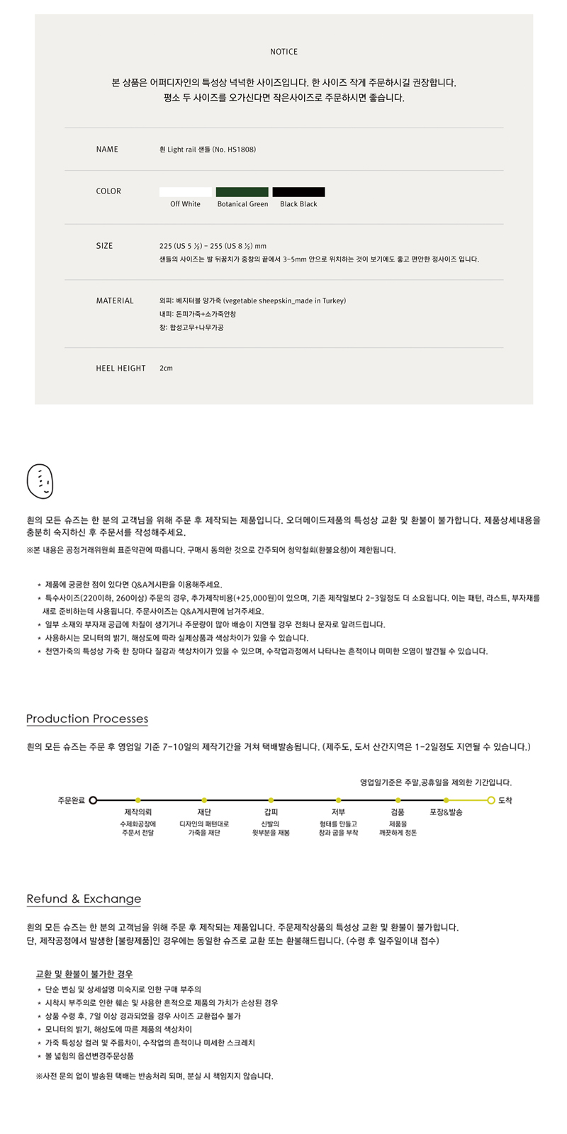 - 주문시 유의사항 : -흰의 모든 슈즈는 한 분을 위해 주문 후 제작하는 오더메이드슈즈입니다. -결제가 완료되면 익일 오전부터 수제화공장을 통해 제작하게되며, 약 일주일의 제작기간을 거쳐 택배를 통해 받으실 수 있습니다. -주문제작상품의 특성상 제품불량이 아닌 단순변심에 의한 교환 및 환불이 어렵습니다. 컬러와 사이즈를 신중하게 결정하신 후 주문해주세요. - 본 상품은 넉넉한 피팅감의 샌들입니다. 한 사이즈 작게 주문하시길 권장합니다. - 평소 두 사이즈를 오가셨다면 작은사이즈로 주문해주세요.