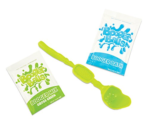 Gather your friends and get ready to pick a booger battle with Booger Balls! Mix 'em, pick 'em, and flick 'em for an epic battle of slimy, gross, outdoor play! Follow the easy instructions to create booger balls that go splat when you throw them! Fling your boogers further with the Booger Balls Flicker Stick and send your friends running in the opposite direction! All components of Booger Balls solution are completely non-toxic, biodegradable, and will not stain clothing, upholstery, or paint. It is suggested that the solution is rinsed with water after play and not left on walls or clothing overnight to avoid residue. Intended for outdoor use only. Appropriate for ages 5 years and up. Set includes 2 solution powder pouches and 1 flicker stick.Feature