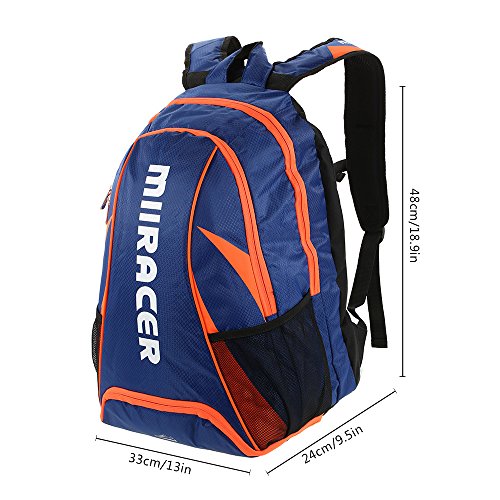 Features: Large main compartment is roomy enough for your apparel and other belongings. Front pocket with multiple pouches to keep valuables well organized. Back compartment with fastener tape to hold your rackets. Two side pockets for water bottle. Bottom pocket with air vent to hold shoes or apparel. Padded, adjustable shoulder straps for comfort. Breathable padded air mesh back keeps your back cool.