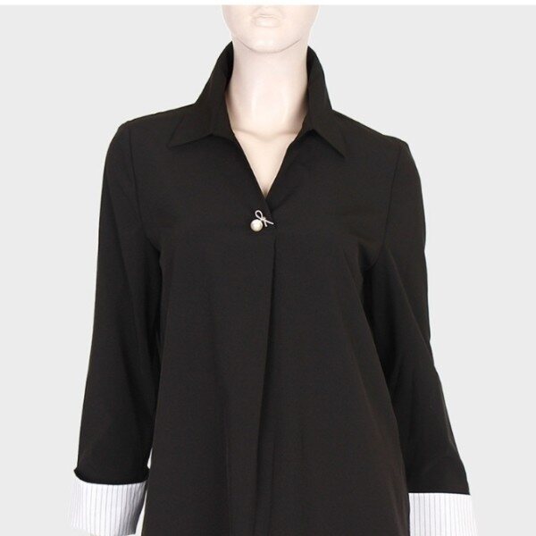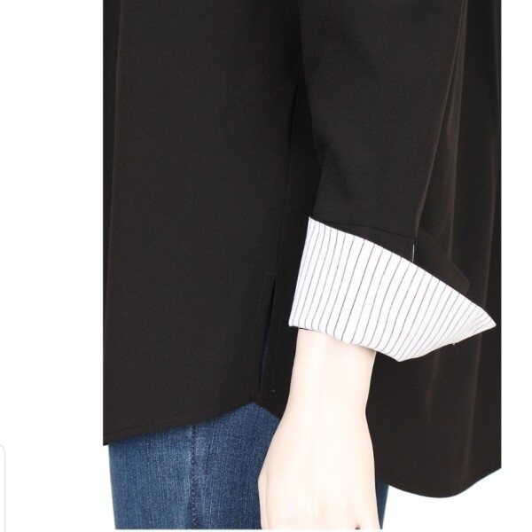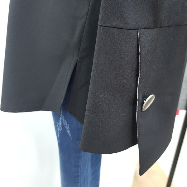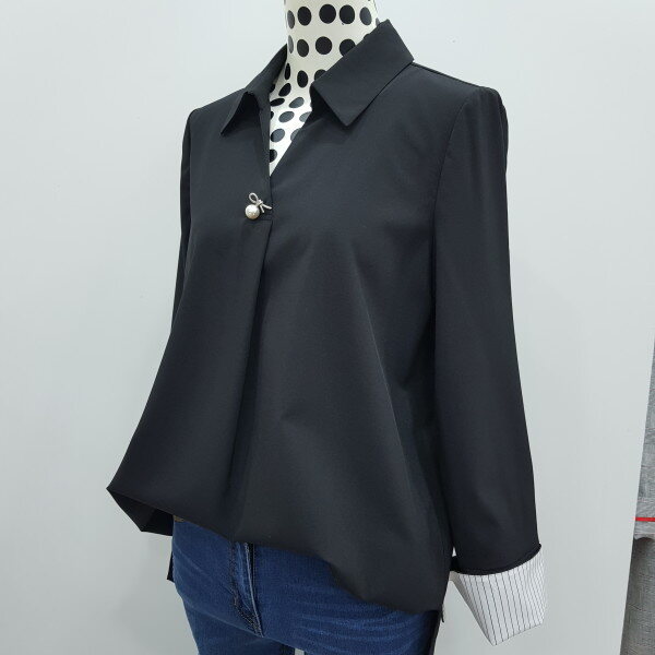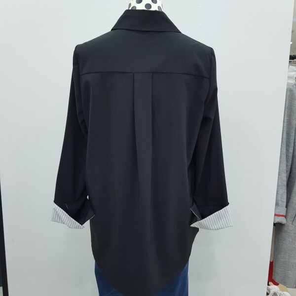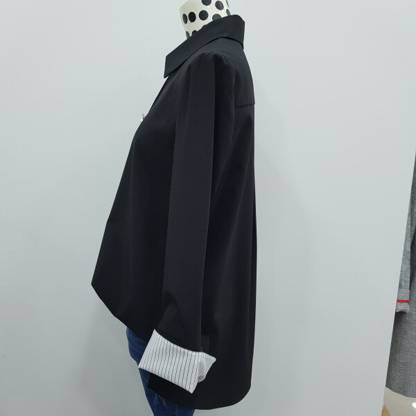 신축성이 있는 원단으로 활동성이 매우 좋답니다.소매 스트라이프 배색은 고급스러운 블랙을 한층 더 돋보이게 합니다.
