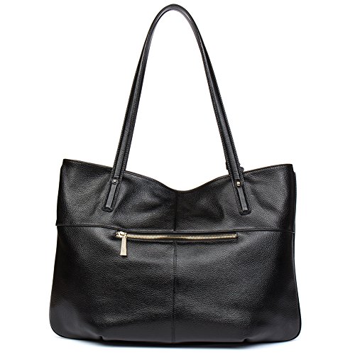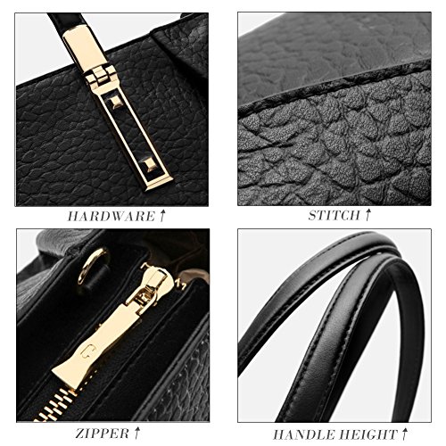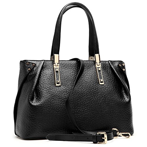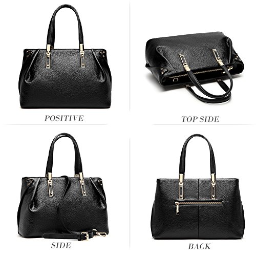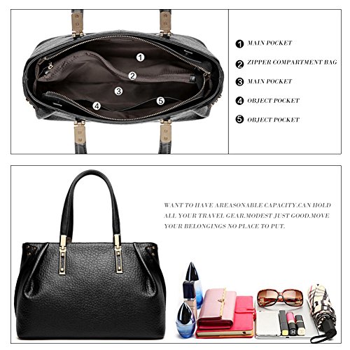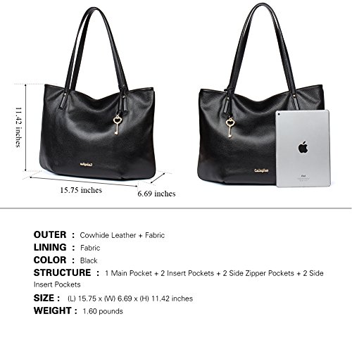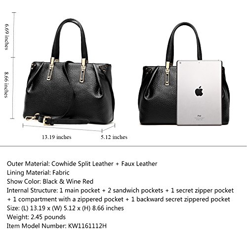 -. Feature : [DURABLE MATERIAL]: Outer material is Cowhide Split Leather + Synthetic Leather, and lining material is Polyester. / [PRACTICAL STRUCTURE]: 1 Main Pocket + 2 Sandwich Pockets + 1 Secret Zipper Pocket + 1 Compartment with Zippered Pocket + 1 Backward Secret Zippered Pocket. Multi-Pockets are apt to store long wallets, cell phones, triple folding umbrellas, Ipads and some other mini daily gadgets. / [HIGH-END HARDWARE & LINING &CLOSURE]: Classic pale gold hardware, the lining material is fabric. Zipper opening closure. / [VERSATILE APPLICATION]: Three carry ways, top hand, crossbody, single shoulder. Stylish and simple appearance makes it particularly suitable for formal occasions, business, shopping and traveling. / [DIMENSIOINS & WEIGHTS]:(L) 13.19 x (W) 5.12 x (H) 8.66 inches, 2.45 pounds, that is to say, this is a lightweight handbag easily carried. Long shoulder strap lengthens 44.09 inches.
