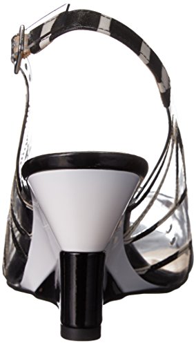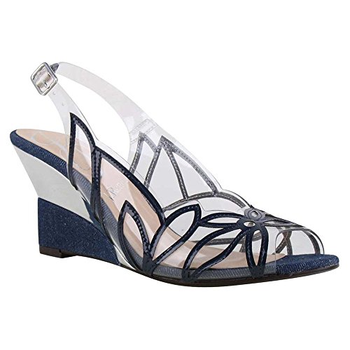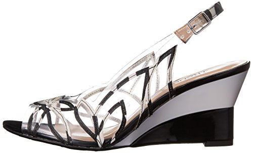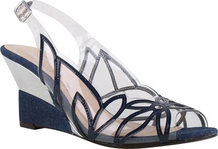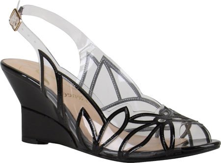 Faux patent leather and vinyl open toe slingback wedge