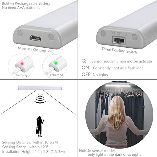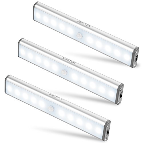 Moston 3 Pack USB Rechargeable 10 LED Magnetic Motion Sensor Cabinet Lights,Dusk to Dawn Photocell,Auto On/Off.Portable,Cordless Sensing Night Light,Stick-on Anywhere for Closet,Wardrobe(Silver)