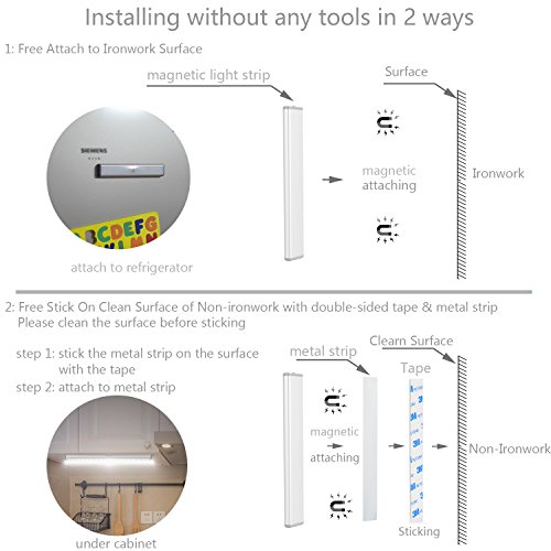 - Integral Aluminium alloy shell with magnet inside,so very easy install this light strips without any tools in 2 ways.WAY 1: Just free attach to any ironwork surface,like refrigerator,barbecue or inside the gun safe;WAY 2:First stick the included metal strip with double-sided tape on any non-ironwork,clean surfaces,than attach the magnetic light bar.Portable,Free exchange places per your desires.
