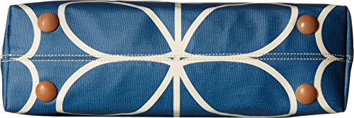 Matt laminated shoulder bag in the 'giant linear stem' print with leather trims and double sided webbing handles and contrast colored zip closure. Inside details include navy linear stem jacquard lining, small leather logo card holder pocket small zip pocket, elasticated key chain and mobile pocket. Silver colored hardware. Handles measure 45.5 cm from top edge of the bag.