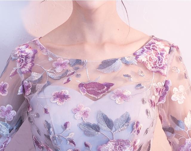 グレーの生地に施されたパープルの花刺繍がとっても華やかです。