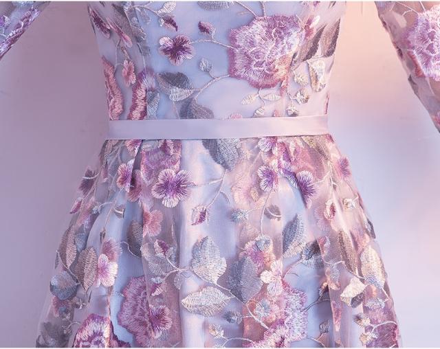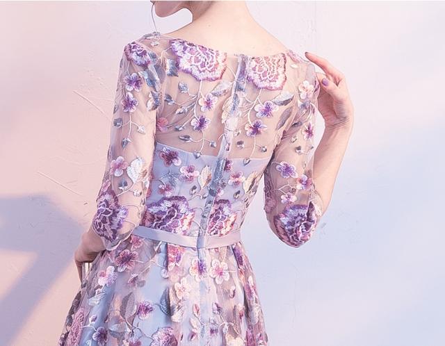 花モチーフの刺繍や、裾の花びらのようなカットが可憐でロマンティックなミディアムドレス。