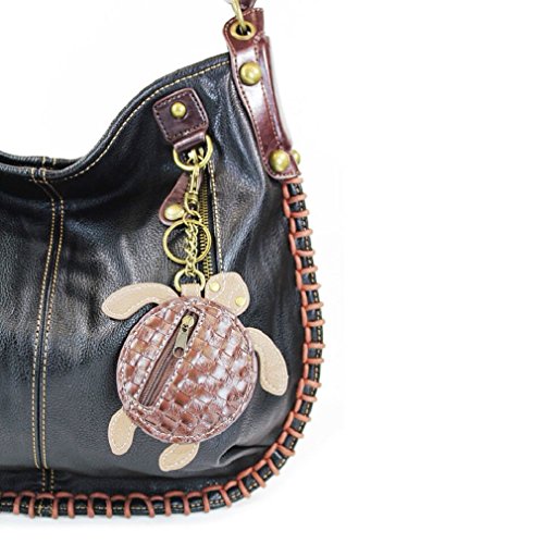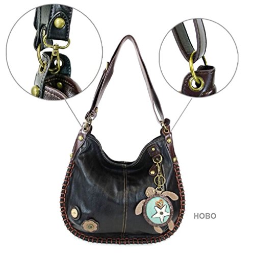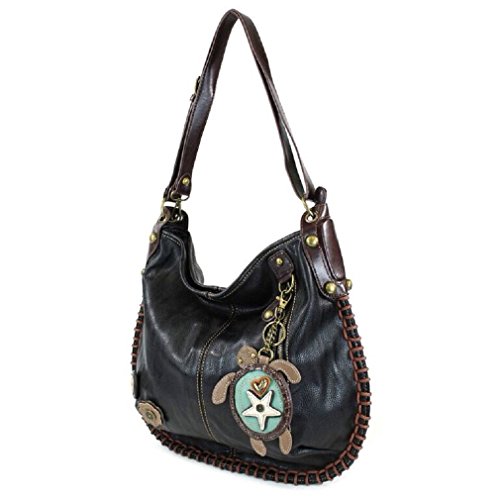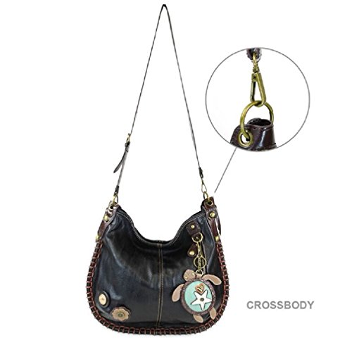 -. Brand : CHALA -. Color : Black -. Department : womens -. EAN : 0619176081265 -. Feature : • Top zip closure / Approx. measurements: 16.5"W x 0.5"D x 15"H, / Converts from Hobo to Crossbody / • Patterned fabric lining with slide pockets and zip pocket inside / Charmed with a cute key fob / coin purse! -. ProductGroup : Shoes -. ProductTypeName : HANDBAG -. Title : Chala Hobo Crossbody Large Tote Bag SEA TURTLE Vegan leather Convertible Black -. UPC : 619176081265