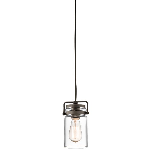 Kichler Lighting 42878OZ Brinley 1LT Mini-Pendant brings a new level of charm to your home with the simply formed pendant in a rich Olde Bronze finish encased by a clear glass shade reminiscent of a wide mouth mason jar. The eclectic form of this wonderful piece will update any home and be appreciated for many years to come. The 42878OZ is 4.75IN in diameter x 7.75IN high. The 42878OZ comes one per package, and requires one (1) 100W medium base incandescent lamp (not included), dimmable using a standard incandescent dimmer. For maximum design impact, you can purchase the Vintage Squirrel Cage Filament Bulbs (4071CLR) separately from Kichler Lighting, as shown in the image. For a more energy efficient alternative, use medium base CFL's or LED's, and let your own green statement be heard, as well as your exquisite good taste. Since 1938, Kichler Lighting has offered a distinctive array of lighting solutions that reflect your individual personality, tastes and plans. Kichler brings you an unparalleled variety of exciting style families, unique finishes, fresh colors and unequaled quality. Whether it's casual, contemporary, transitional or traditional, you'll find it with Kichler, lighting that defines your style.Feature