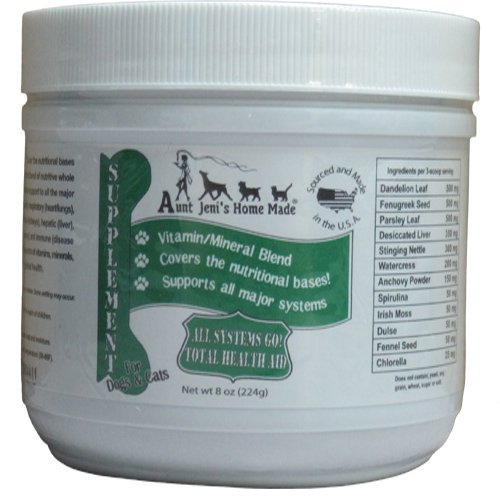 -. Binding : Misc. -. Brand : Aunt Jeni's Home Made -. EAN : 0825696510905 -. Feature : Vitamin/mineral blend / Supports all major systems / Made in USA -. Label : Aunt Jeni's Home Made -. Manufacturer : Aunt Jeni's Home Made -. Model : ESD -. MPN : ESD -. PackageQuantity : 1 -. PartNumber : ESD -. ProductGroup : Pet Products -. ProductTypeName : PET_SUPPLIES -. Publisher : Aunt Jeni's Home Made -. Studio : Aunt Jeni's Home Made -. Title : Aunt Jeni's Home Made All Systems Go Total Health Aid for Pets -. UPC : 825696510905