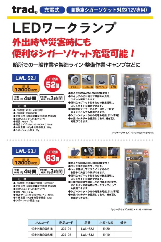 【商品名】 TRAD 充電式LEDワークランプ(LEDライト/LED照明) 63灯 フック付き LWL-63J 〔作業用/アウトドア用品〕 【ジャンル・特徴】 暗所での作業・外出時・災害時等色々な場面で!LEDランプ ■サイズ・色違い・関連商品■52灯 1個■52灯 3個セット■63灯 1個[当ページ]■63灯 3個セット■78灯 2個セット■78灯 5個セット ■商品内容 暗所での一般作業や製造ライン・整備作業・キャンプなどに。 明るさ13000MCD LEDx63個使用! 吊り下げに便利なフック付き。ヘッド部が上下にスライドするのでお好みの角度で作業ができます。 便利なマグネット付きなので作業環境に応じてライトを固定できます。三脚付きなので固定しての作業に便利です。また、スタンド収納時はワークランプとしても使用できます。 シガーソケットからの充電も可能。(12V専用) 水素バッテリーを採用しており、継ぎ足し充電ができます。■商品スペックLED照度:13000MCD 充電時間約4時間 使用可能時間約3時間 ●仕様 LED個数:63個 800Mahニッケル水素バッテリー 材