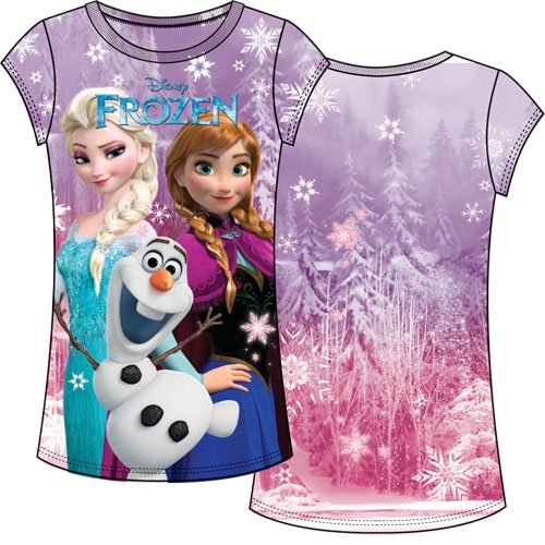 Girls' tee features Elsa, Anna, and Olaf in a sublimated design. In purple. 100% polyester. Machine washable. Imported.