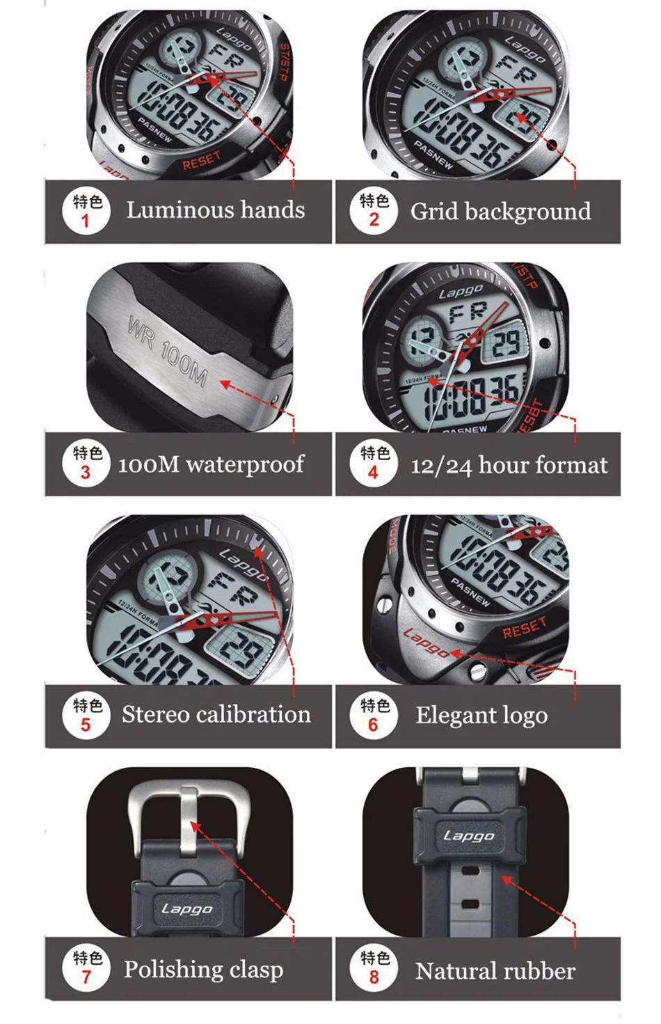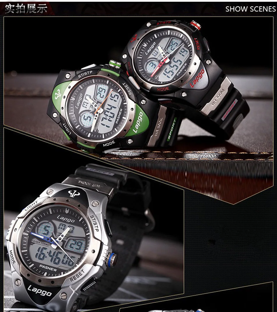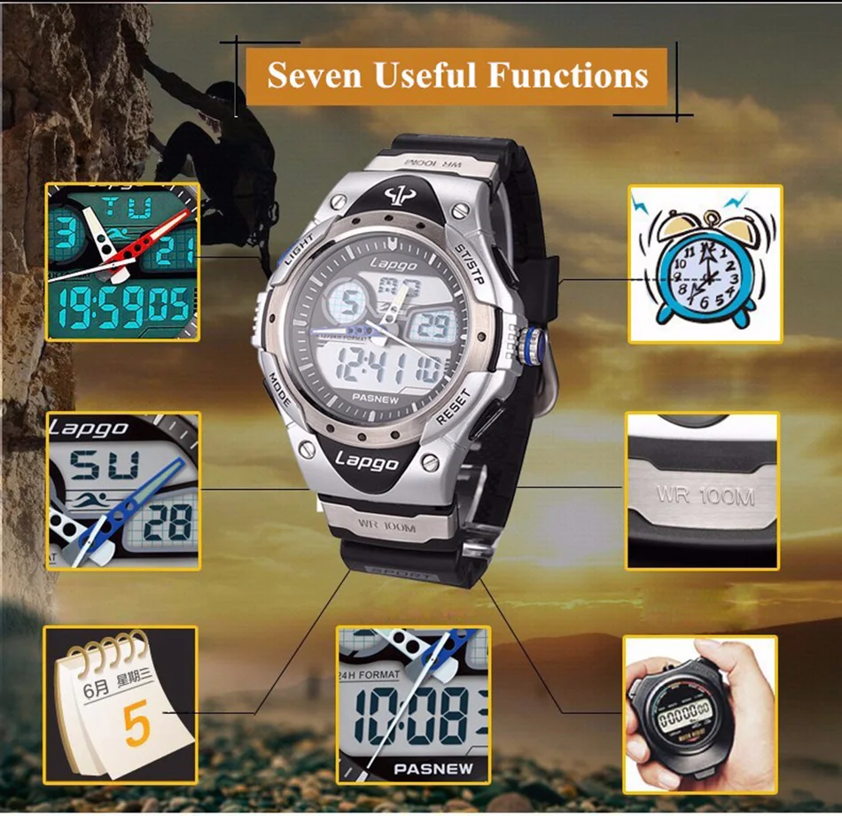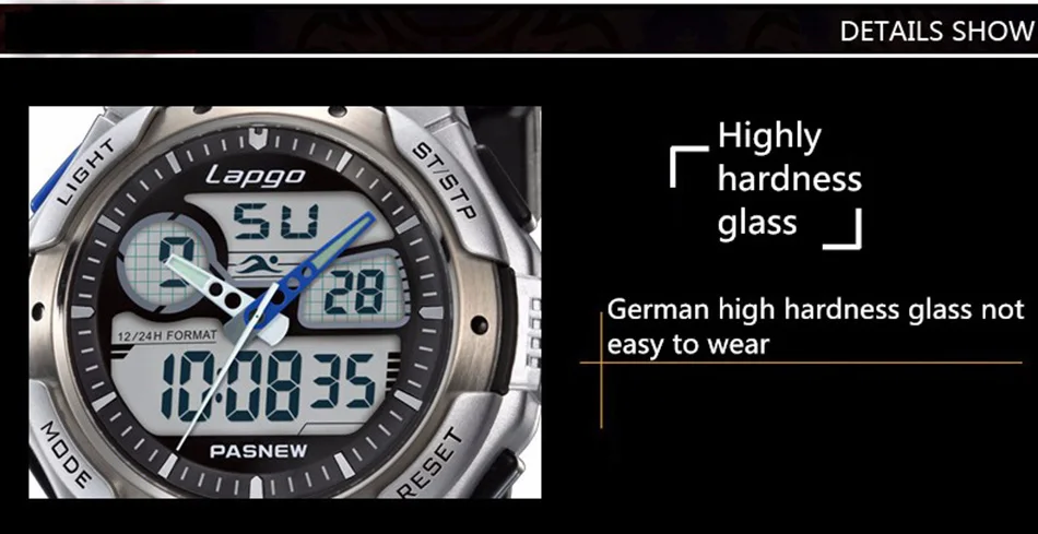 Feature:Complete Calendar,Shock Resistant,Stop Watch,LED display,Auto Date,Water Resistant,Diver,Back Light,Chronograph,Swim,Alarm