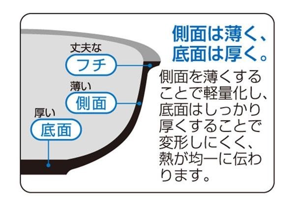 | 素材・材質 | 本体:アルミニウム合金 はり底:ステンレス鋼(クロム18%) ※底の厚さ3.7mm(はり底含む) 蓋:全面物理強化ガラス 取っ手・蓋ツマミ:フェノール樹脂 |