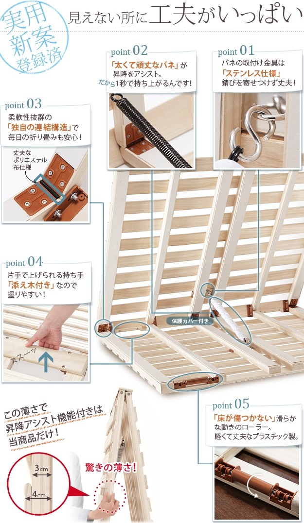 材質:本体-天然木(桐)・生地仕上げ、床接地面-ウレタン発泡ゴム、ローラー・ローラー受け-ABS樹脂、バネ固定金具-ステンレス