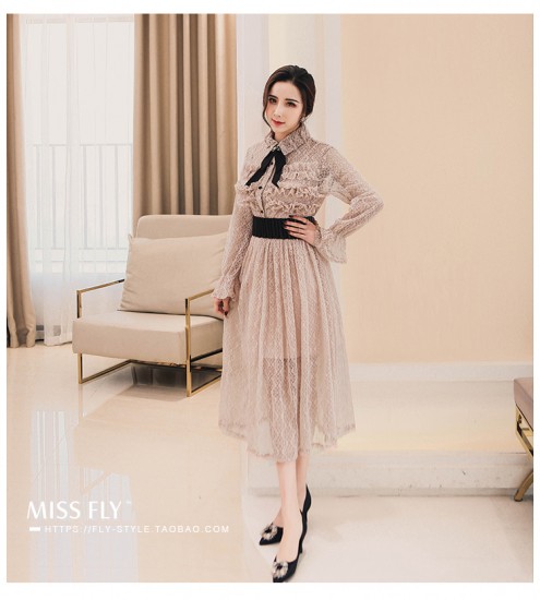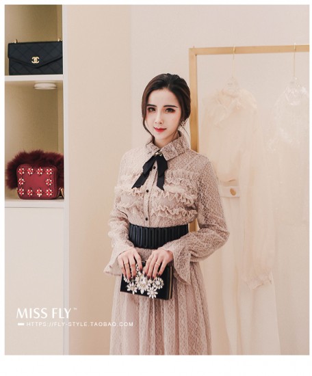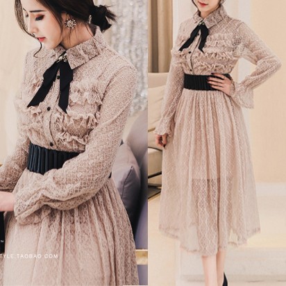 レースやフリルをふんだんにあしらわれたミモレ丈のワンピースです。