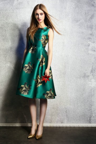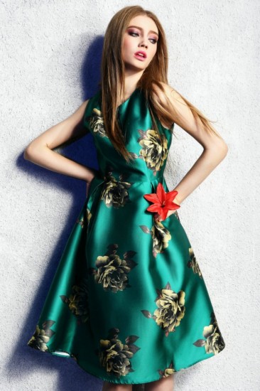 大きな花柄の、ノースリーブひざ丈Aラインドレス。