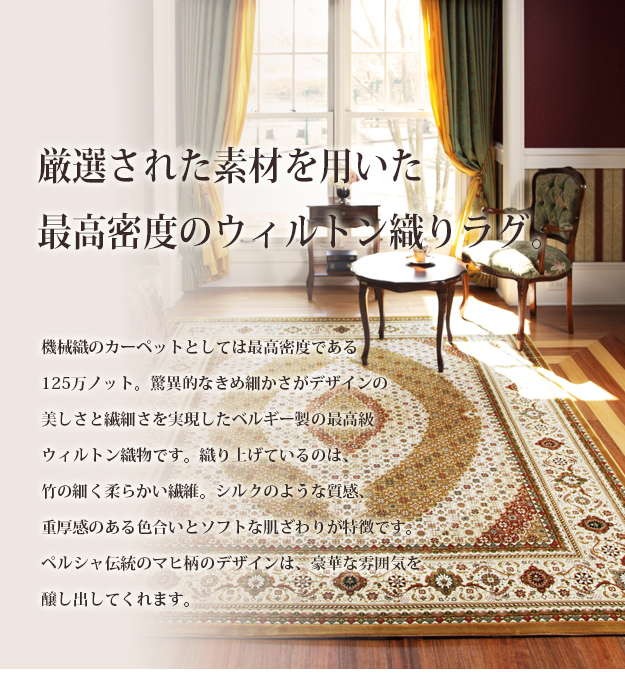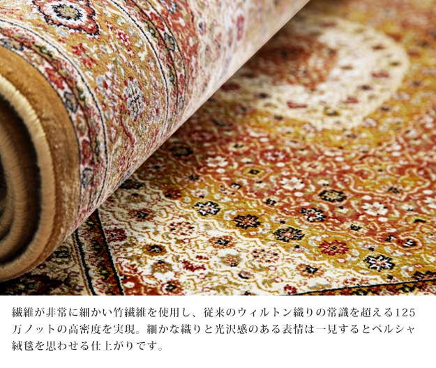 商品について:驚異的なきめ細かさでデザインの美しさと繊細さを実現したベルギー製の最高級ウィルトン織物です。機械織のカーペットとしては最高密度である125万ノット。織り上げているのは、竹の細く柔らかい繊維。