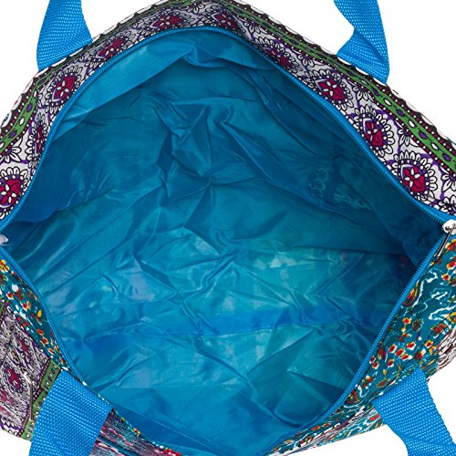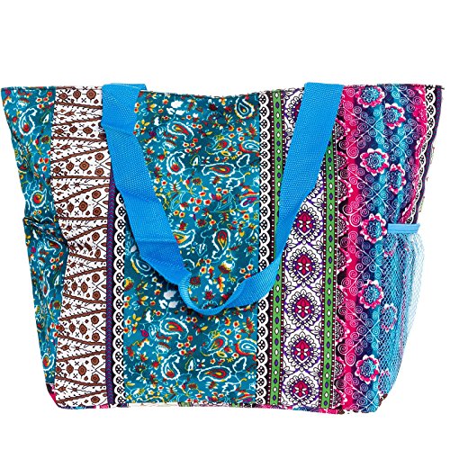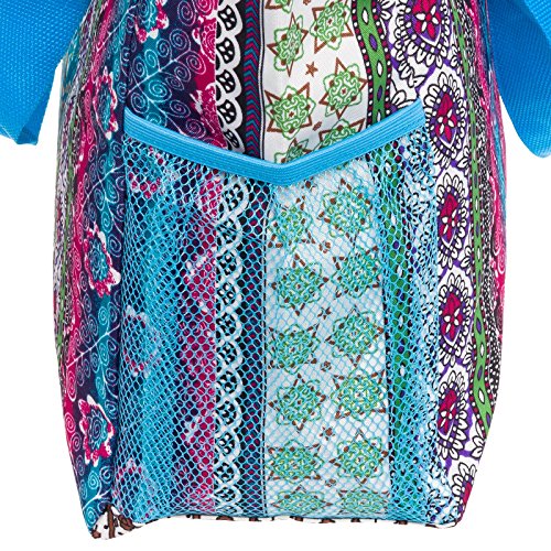 -. Feature : Organization: Staying organized can make your life cleaner and less stressful. With a large zippered main compartment, 2 exterior slip pockets, and a back zippered pocket you'll be able to organize your belongings how you wish. Store your towels, clothes, groceries, and whatever else you find this bag useful for quickly and easily. / On the Go: If you have a busy lifestyle then you need a purse to match. This travel tote is perfect for a trip to the mall, beach, or just going out on the town. It's small and lightweight construction can still hold all of your daily essentials without weighing you down. / Design: Featuring a unique pattern and color combination this one of a kind bag is a perfect blend of quality and value. Lightweight polyester materials can be easily spot cleaned and includes durable nylon straps for easy carrying. Spacious size and design allow you to use this bag as a shopping tote, beach bag, travel tote, or carry-on bag. / Cleaning: Spills can just ruin your day and your bag. In the event of a spill the polyester exterior and lined interior can be easily cleaned. Most spills can be quickly wiped off with a damp cloth immediately after noticing it and you'll be good to go. / Measures 18.5" x 13.75" x 6.5"
