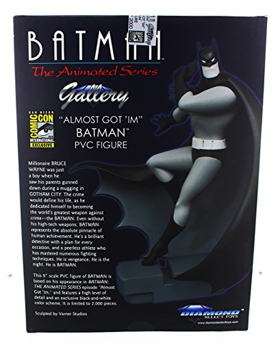 Packaged in a full-color window box and sculpted by Varner Studios, the Batman: The Animated Series Black and White 9-Inch Statue is limited to 2,000 pieces! Ages 13 and up. We reserve the right to limit quantities ordered.