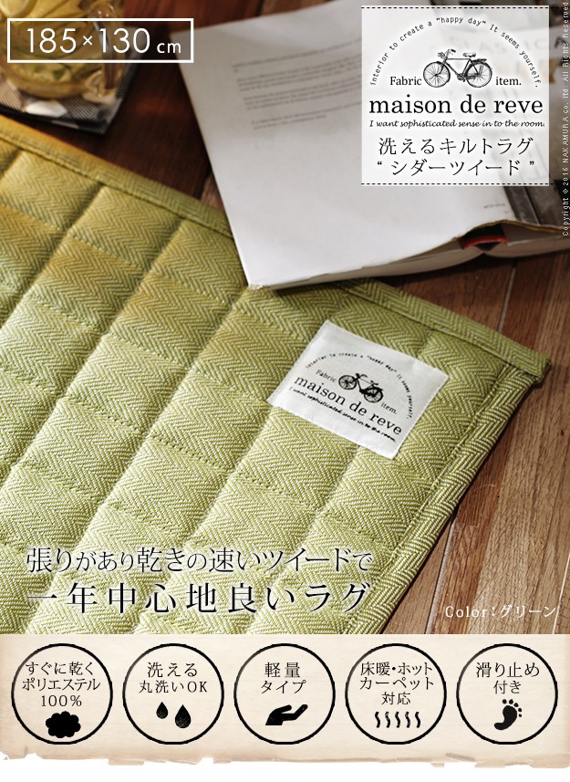 ※メーカー直送のため代金引換はお受けできません。※沖縄・一部離島は別途送料がかかります。お見積もりいたしますのでお問い合わせ下さい。【カラーバリエーション】アイボリー・グリーン・ブルー【仕様】本体:ポリエステル100%裏面:不織布(滑り止め加工)中綿:ポリエステル100%【サイズ】約185x130cm重量:約2kg株式会社ナカムラ(33100076)