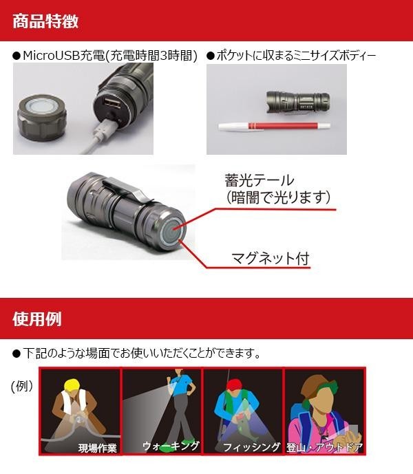 | 仕様 | 明るさ:最大200ルーメン 点灯モード:High200ルーメン(2.5時間)/Middle100ルーメン(5時間)/Low20ルーメン(10時間)/SOSモード、クイックフラッシュ(18時間) 防塵防水性能:IP64 光源:チップ型LED1灯 電源:Li-ONバッテリ(内蔵・充放電目安500回) 充電時間:約3時間 USBケーブルの長さ:46cm その他機能:フォーカス調整機能、テール部マグネット付 取扱説明書(パッケージに記載) |