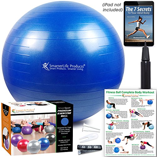 AN EXERCISE BALL IS THE EASIEST AND LOWEST IMPACT WAY TO ACHIEVE YOUR MULTIPLE FITNESS GOALS! Do you want to tone your core, abs and quads; improve your balance; and target key muscle groups? Is it important to you that the exercise ball you use is of the highest quality, durability, and safe? If so, the SmarterLife Products exercise ball is the perfect choice! Our exercise balls are manufactured to demanding specifications, made of the highest quality PVC material available, and are made to last a lifetime! Designed for effectiveness and safety in mind, our exercise balls are perfect for women, men, children; strong enough for the most rigorous exercise routines; ideal for yoga, Pilates, CrossFit, and more! Key features of our exercise ball: Anti-Burst Design Non-Slip Surface High Quality Construction Inflation Measuring Tape (included) High quality hand pump Included in The Box: Exercise Ball, hand pump, inflation tape, ball plugs, inflation instructions, exercise guide Choice of 45cm, 55cm, 65cm, and 75cm sizes (see image above for sizing instructions) Order now and receive free eBook "The 7 Secrets To Your Ideal Body" (emailed separately) We Are SmarterLife Products We are a small, family-owned business based in Colorado that offers fitness products for people who want to live smarter. ?? Help Us Save The Planet ?? For every unit sold, we donate 2 trees to Trees For The Future, which has planted over 115 million trees in dozens of countries, revitalized hundreds of thousands of acres of soil while changing people's lives forever!! Your purchase has a direct impact on the earth and lives of the people who need it most. By helping us plant trees, you give families the ability to transition from unsustainable farming techniques to a Forest Garden System. 0 |
