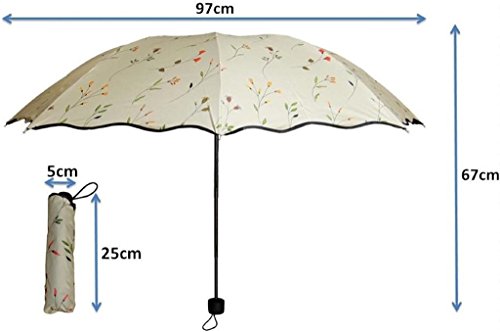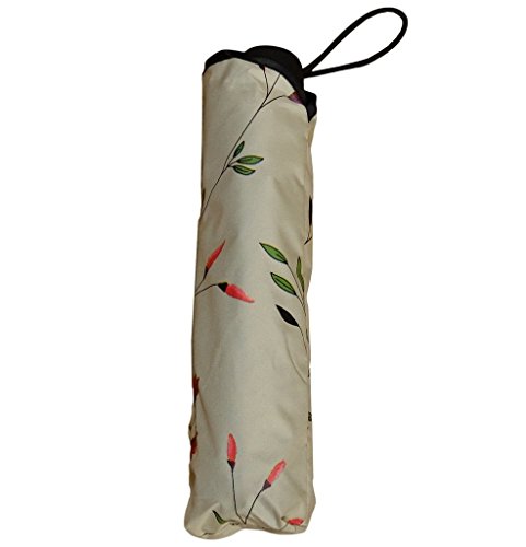 -. Feature : コンパクトで軽量な晴雨兼用傘です。飽きの来ない花柄と生地色がライトカラーなので雨の日も楽しめそうです。サイズ: 親骨: (約)67cm 収納時: (約)直径5.0cm×長さ25cm ※ハンドルを含めた最大直径サイズ(約)8.5cm 使用時: (約)直径97cm材質: ポリエステル100% / アルミ 他 重量: (約)350g / 遮光率: 100% UV遮蔽率: 99.9% UPF評価: UPF50+ 素材:生地:高密度撥水PG材料、親骨:グラスファイバーとスチール、受骨:スチール、中棒:スチール ハンドル:天然ゴム、特殊加工:ブラックコロイドでUVプロテクションコーティング加工 / 耐久性ある樹脂繊維と8本の折れにくいスチール製の傘骨で、強風にも強いです。ワンタッチボタンで開閉するので便利で安全です。折りたたみ式なので、鞄に常備することで急な雨の時にも安心です。 / 特記事項 ※商品の布地には撥水加工を施しておりますが、激しい雨の際は、雨水が傘生地にしみる事があります、ご了承ください。また強風時は破損する恐れがありますので使用をお控えください。 ※雨天時の使用後は傘を広げて十分に湿気を取り除いてください。湿ったまま保管しますと、金属部分の錆の原因となります。 / ※こちらの商品はU-TOOのオリジナル傘です。今商標出願中ですが、商願2016- 92768。U-TOO以外の第三者による販売行為はご遠慮ください。