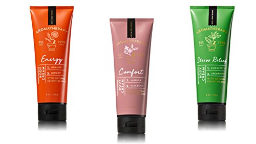-. Binding : Misc. -. Brand : Bath & Body Works -. EAN : 0725512328618 -. Feature : Bundle includes a lot of 3 Bath & Body Works Aromatherapy Body Cream / 8 fl oz each / Includes 1 of each of the following scents: Stress Relief Eucalyptus Spearmint, Comfort Vanilla & Patchouli, and Energy Orange Ginger -. IsAdultProduct : 0 -. Label : Bath and Body Works -. Manufacturer : Bath and Body Works -. MPN : NA -. PartNumber : NA -. ProductGroup : Beauty -. ProductTypeName : BEAUTY -. Publisher : Bath and Body Works -. Studio : Bath and Body Works -. Title : Aromatherapy Moisturizing Body Cream Trio - 3 Pack (Stress Relief, Comfort, and Energy) -. UPC : 725512328618