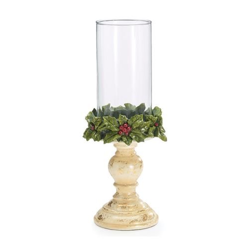 [Product Information]- Ivory hand-painted resin pedestal candleholder with gold and glitter, accented with holly and berries at the bottom of the glass