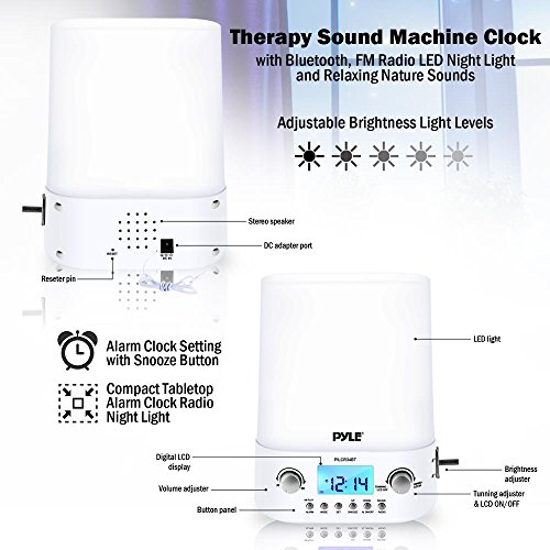 The Pyle Bluetooth Radio Alarm Clock will fill your bedroom with relaxing nature sounds -- along with Bluetooth wireless streaming music. This multi-function speaker system combines an alarm clock, radio and night light -- all in one. Feel at ease and get a good night's rest when you activate the comforting and soothing sounds. Built-in wireless Bluetooth ability allows you to connect your device and enjoy hassle-free music streaming. Another unique feature includes the illuminating and self-adjusting LED lights. Choose from two selectable modes, Sunrise Sunset, that allow the lights to imitate the hours in the day, and automatically brighten dim. Use it as a night light in the little one's room or just use it for deep sleep relaxation. Features: Compact Tabletop Alarm Clock Radio Night Light Built-in Soft Sounding Nature Effects Soothing Tones (10) Selectable Therapeutic Continuously Looping Nature Sounds Wireless Bluetooth Audio Streaming Ability Connect Stream Music from Your Favorite Devices (Works with Smartphones, Tablets, Laptops, etc.) Illuminating Self-Adjusting LED lights Sunrise Light Alarm: Gradually Brightens Upon Wake-up Sunset Light Sleep Timer: Gradually Dims Audio Fades-out Adjustable Brightness Light Levels FM Radio with Digital LCD Display Built-in Stereo Speakers Alarm Clock Setting with Snooze Button Displays Year, Month, Week, Day Time Perfect for Deep Sleep, Relaxation Meditating Wireless Bluetooth Connectivity: Connect Stream Music from Your Favorite Devices Works with Smartphones, Tablets, Laptops, etc. Bluetooth Network Name: ‘Pyle Audio’ Bluetooth Version: 2.0 Wireless Range: 30’ ft. Technical Specs: Includes Wall Power Adapter (DC 6V) Power: 100/240V Dimensions (L x W x H): 5.9' x 3.1' x 7.5' Sold as: 1 Weight: 1.38 lbs. 0 |