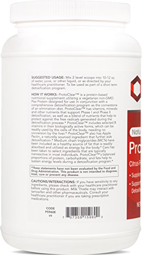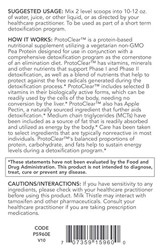 HOW IT WORKS: ProtoClearTM is a protein-based nutritional supplement utilizing a vegetarian non-GMO Pea Protein designed for use in conjunction with a comprehensive detoxification program as the cornerstone of an elimination diet. ProtoClearTM has vitamins, minerals and other nutrients that support Phase I and Phase II detoxification, as well as a blend of nutrients that help to protect against the free radicals generated during the detoxification process.* ProtoClearTM includes selected B vitamins in their biologically active forms, which can be readily used by the cells of the body, needing no conversion by the liver.* Medium chain triglycerides (MCTs) have been included as a source of fat that is readily absorbed and utilized as energy by the body.* Care has been taken to select ingredients that are typically nonreactive in most individuals. ProtoClearTM's balanced proportions of protein, carbohydrate, and fats help to sustain energy levels during a detoxification program.*