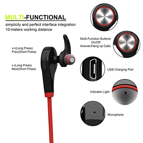 Easy Access and long time standby: 10-meter working distance, The simple user interface on one of the earphones allows you adjust the volume, play/pause, select songs and answer/hang up calls completely effortlessly.Powerful rechargeable battery provide 5 hours of Talking/Playing time