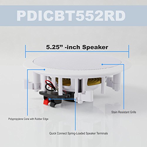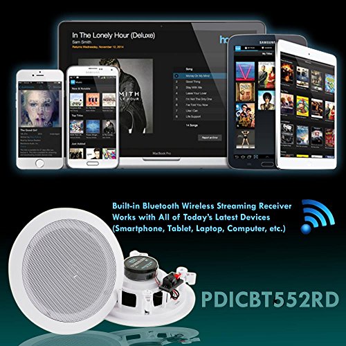 The Pyle In-Wall/Ceiling Bluetooth Speaker Kit delivers effortless stereo sound to any room in your home or office. The included Bluetooth controller allows for wireless music streaming ability and doubles as a sound processing digital amplifier. You will be able to stream audio from all of your favorite Bluetooth devices (like smartphones, tablets and computers). Each round-style speaker features a high-compliance polymer tweeter that delivers full, rich sound without cluttering floor space. They are made of environmental friendly ABS material and include a cut-out template for easy installation. Mount them in a convenient location on the wall or ceiling for a flush, clean look. Achieve wide-range sound performance and add audio to any room with the Pyle In-Wall/Ceiling Bluetooth Speaker Kit.