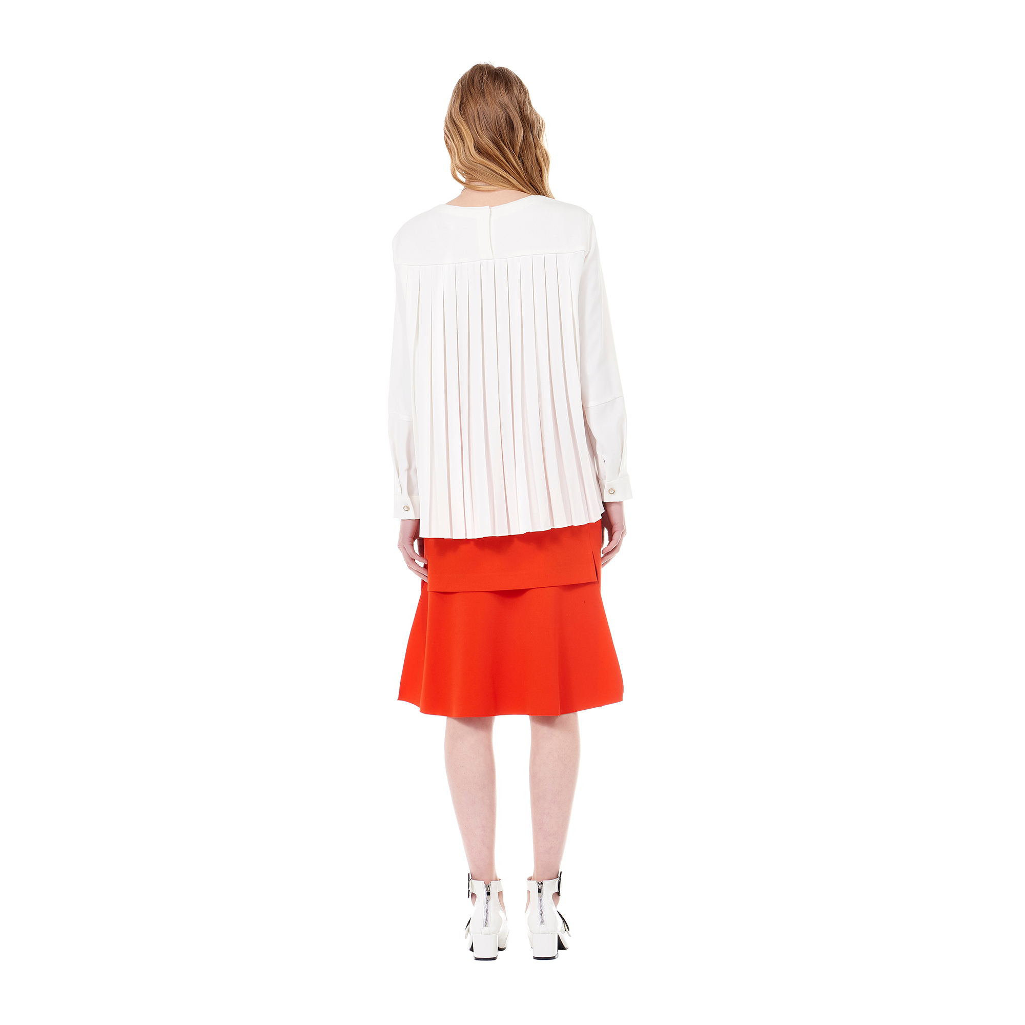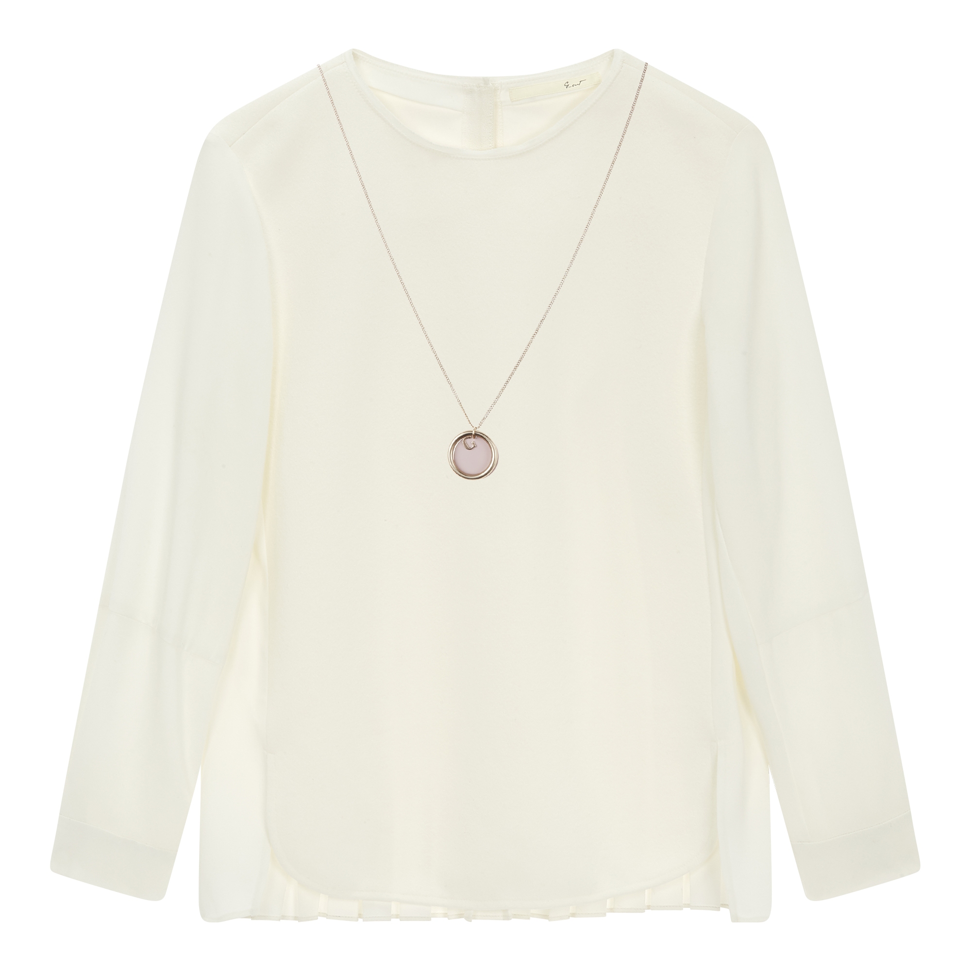 컬렉션 : 2018 Spring/Summer 디자인 포인트 : - 뒷면에 플리츠 디테일이 돋보이는 페미닌한 무드의 블라우스- 소매 커프스에 진주 버튼 디테일로 포인트를 더한 디자인- 목걸이와 같이 다양한 연출이 가능한 아이템 스타일링 추천 : 베이직한 슬랙스 팬츠 혹은 부츠컷 팬츠와 트렌디한 페미닌룩을 연출 할 수 있음