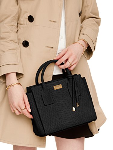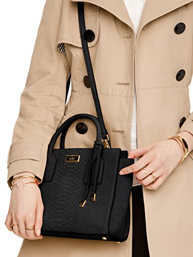8.2"h x 9.8"w x 4.7"d drop length: 3.1" handheld strap length: 44.5" matte snake with monza smooth leather trim capital kate jacquard lining 14-karat light gold plated hardware tassle on front handle top handle elbow bag with snap tab closure adjustable removable shoulder strap double slide pockets and interior zip pocket gold staple kate spade new york signatureFeature